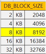 - 파라미터 DB_BLOCK_SIZE 기본 블럭 사이즈 설정 ( Oracle 9i 4K / 10g 8K Default Value )