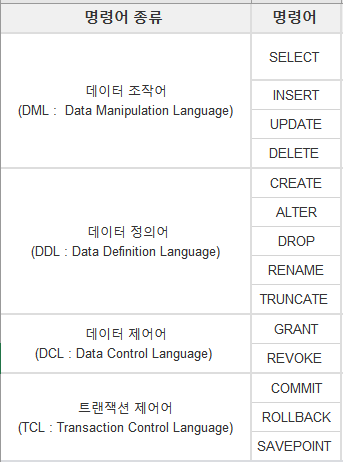 CREATE | 테이블과 같은 데이터 구조를 정의하는데 사용되는 명령어들로 (생성, 변경, 삭제, 이름변경) 데이터 구조와 관련된 명령어들을 말함. |